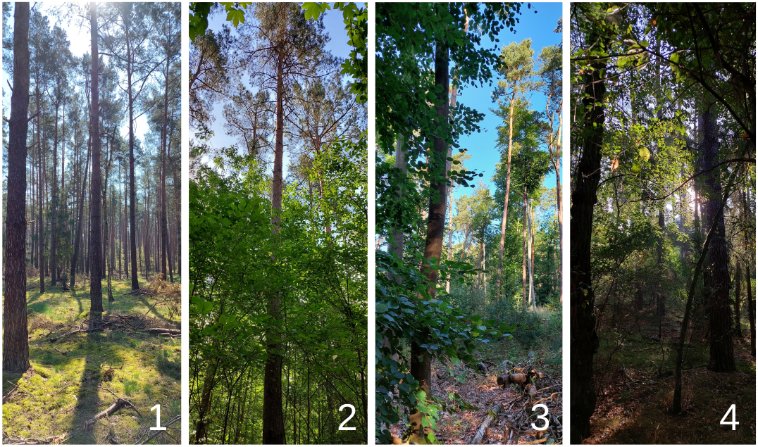 Die Komplexität der Bestandsstruktur meint hier zwei Aspekte: zum einen die Diversität der Baumarten, die das Kronendach bilden, zum anderen, ob unter dem Kronendach ein Unterstand von Bäumen vorhanden ist. Zum Unterstand zählt hier die Gesamtheit der Pflanzen bis zu einer Höhe von 10 Meter, wobei der Fokus auf Gehölzarten liegt. Bild 2 zeigt beispielhaft vier unterschiedlich strukturierte Versuchsflächen.